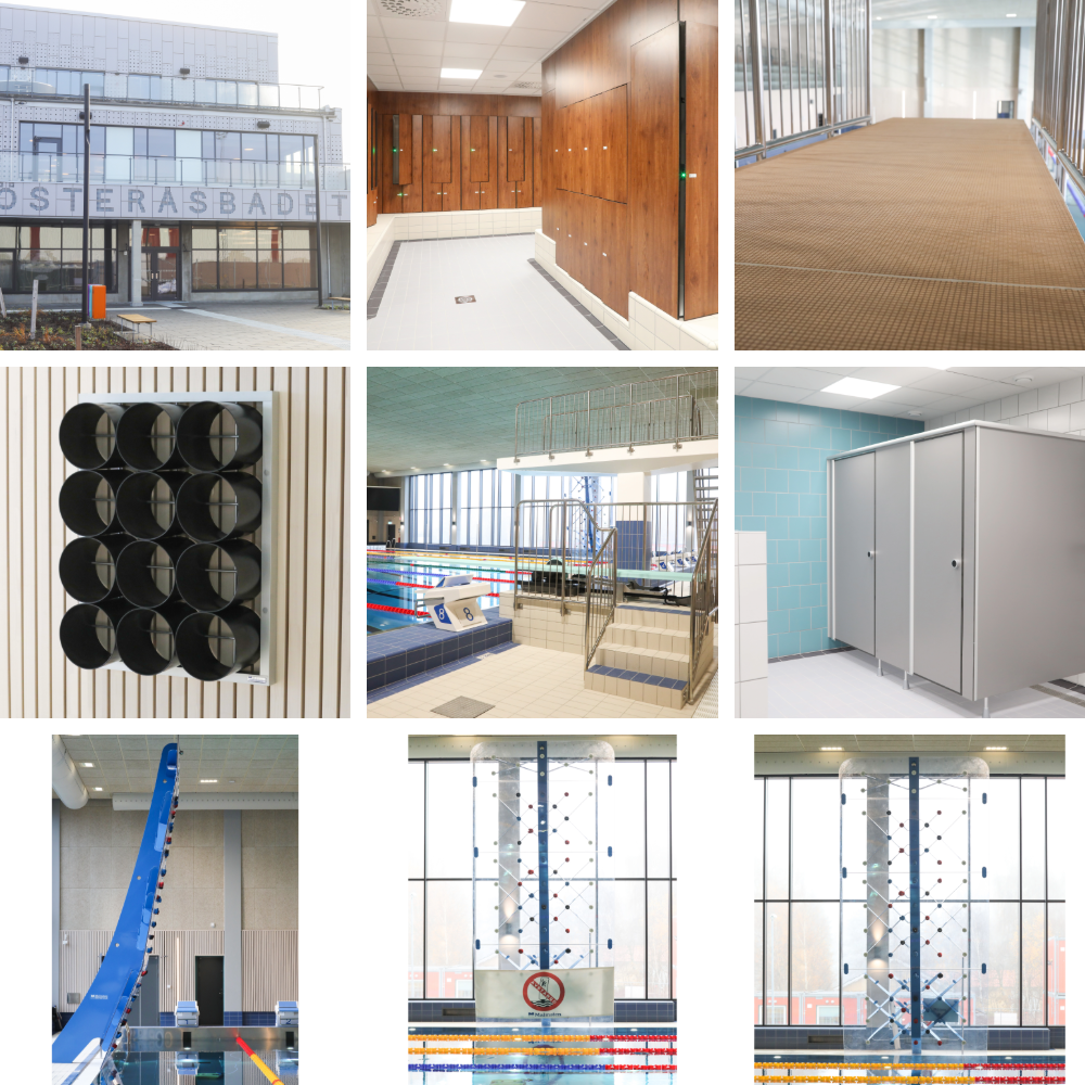 I Täby nya simhall har vi levererat och installerat samtliga omklädningsskåp i kompaktlaminat. Alla lejdare och ingjutningsgods kommer från Malmstens. I 50m bassängen har det installerats en höj- och sänkbar bro. Det finns även två multibassänger med mellanbottnar i detta fina projekt. En 1m svikt är installerad samt Treadmastermatta är monterad på 3m hoppplatån.