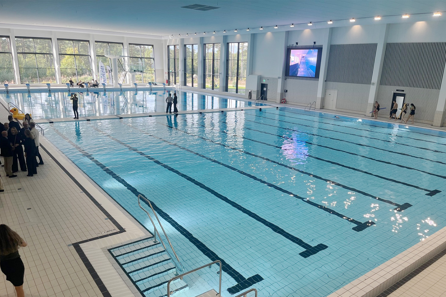 I nya Harjagerbadet i Kävlinge har vi installerat startpallar och svikt från Duraflex. Även den stora bildskärmen samt tidtagningssystemet från Colorado Timing har levererats och installerats av Malmsten Entreprenad AB.